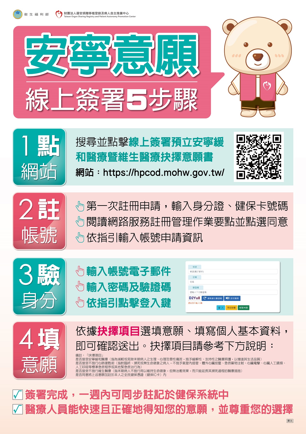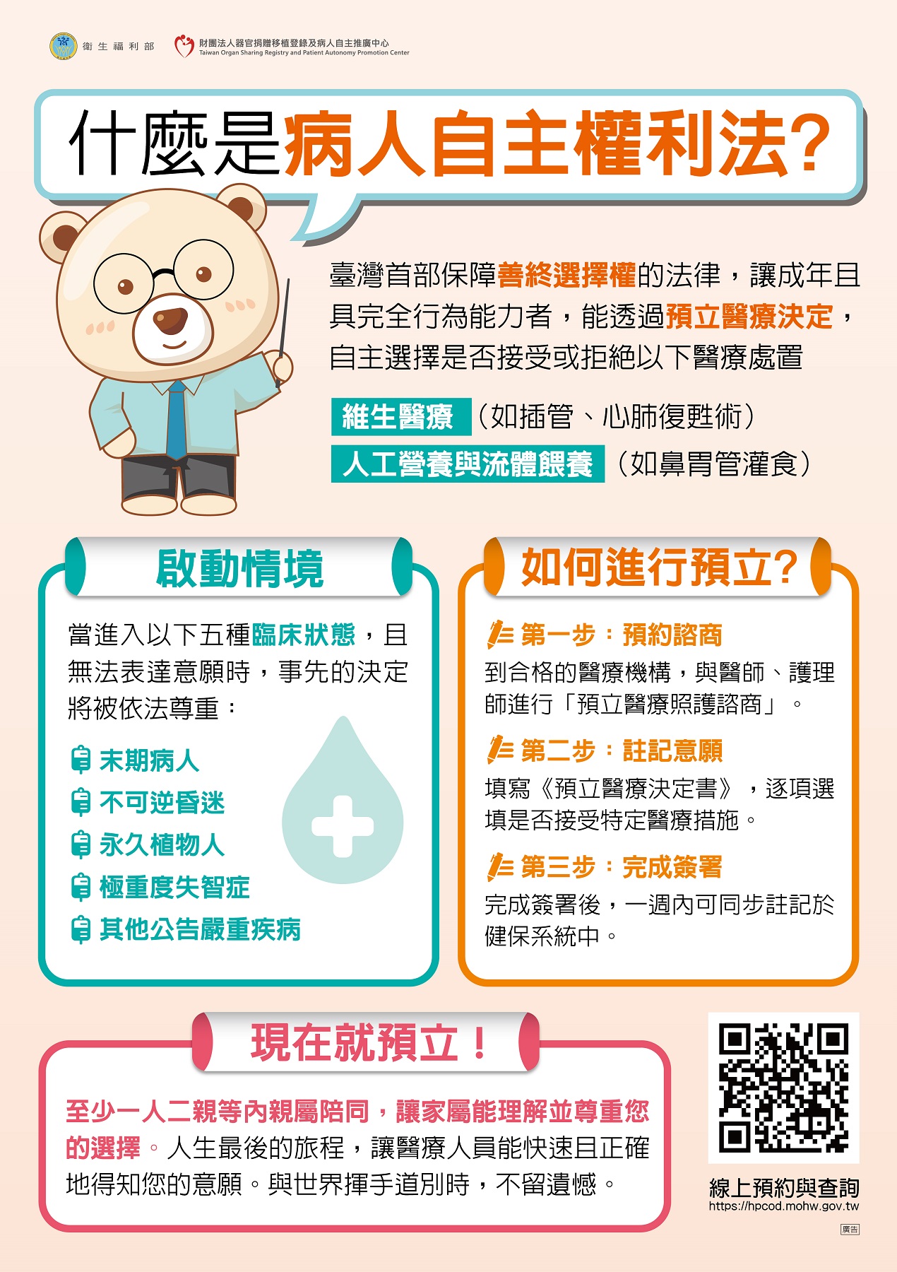 《病人自主權利法》:於2019年1月6日上路,讓意願人透過「預立醫療照護諮商」,簽署「預立醫療決定書」,得以預立醫療的選擇。