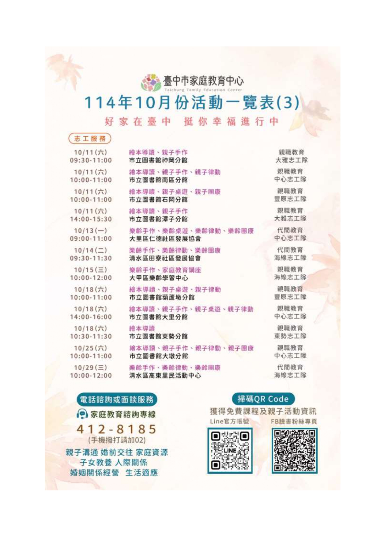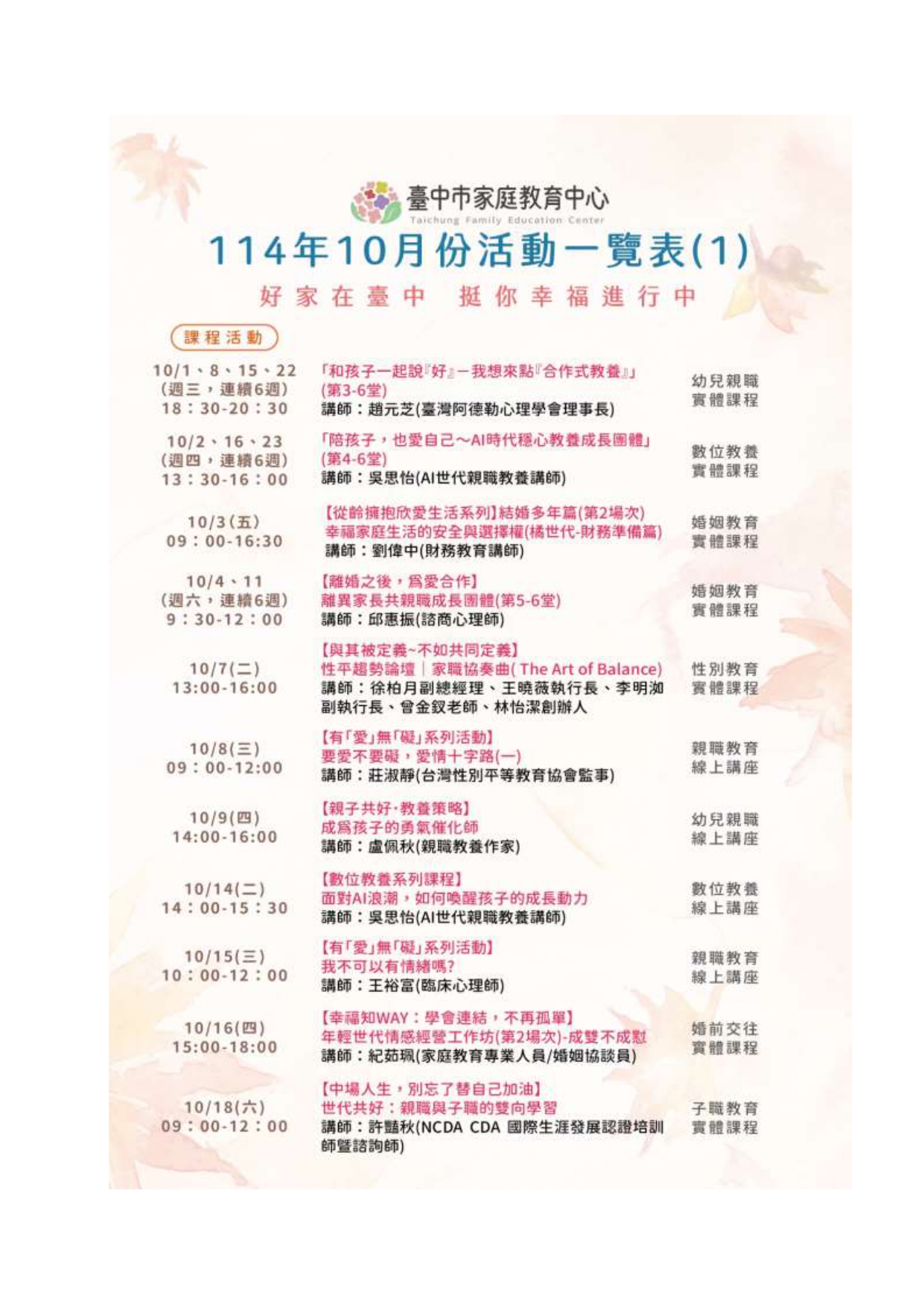 從親職教育、數位教養、婚姻經營、青少年溝通、情緒管理、幼兒教養到原住民族家庭教育、子職關係探索、婚前交往準備等主題應有盡有,讓我們在溫馨互動的氛圍中學習,累積創造幸福、和諧家庭的力量!更多詳細內容歡迎查看活動海報、或加入臺中市家庭教育中心的官方粉絲專頁 https://reurl.cc/7VQa8l 及官方LINE,以追蹤更豐富的活動資訊。