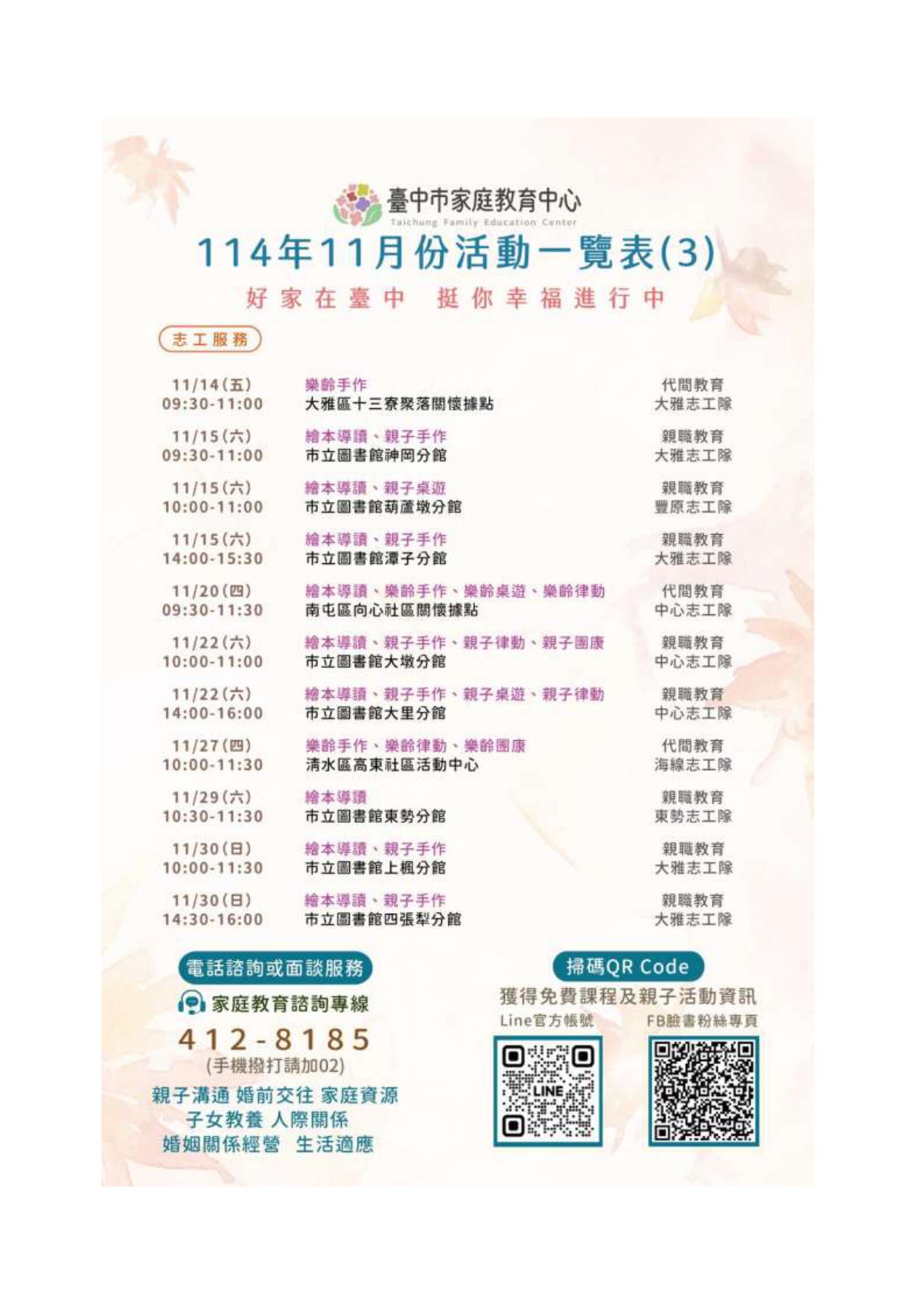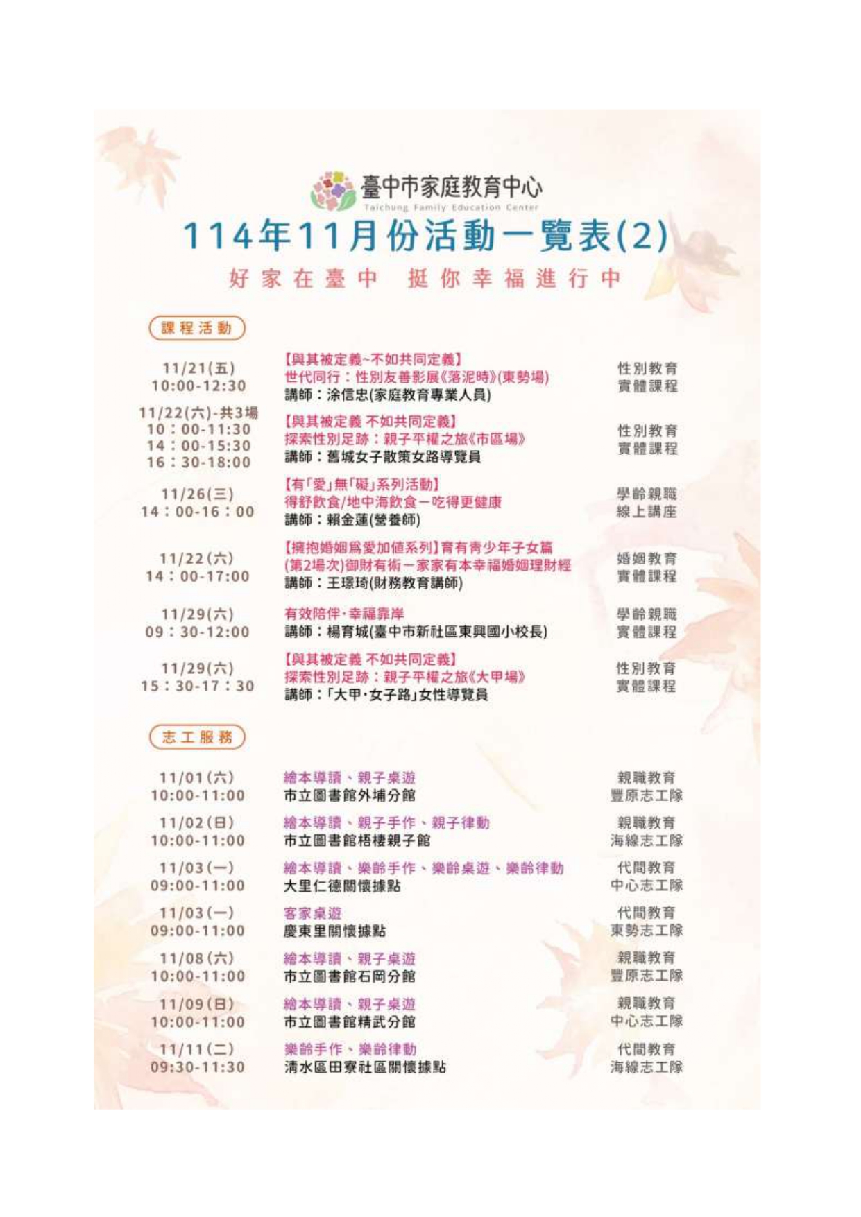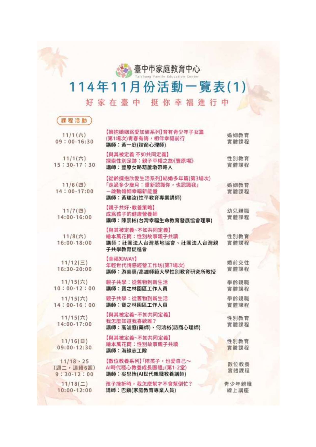【轉知】臺中市家庭教育中心114年11月份活動臺中市家庭教育中心邀您一起參與本月精彩多元的課程活動~ 從親職教育、數位教養、婚姻經營、青少年溝通、情緒管理、幼兒教養到到多元型態家庭學習、 婚前交往準備等主題應有盡有, 讓我們在溫馨互動的氛圍中學習,累積創造幸福、和諧家庭的力量!