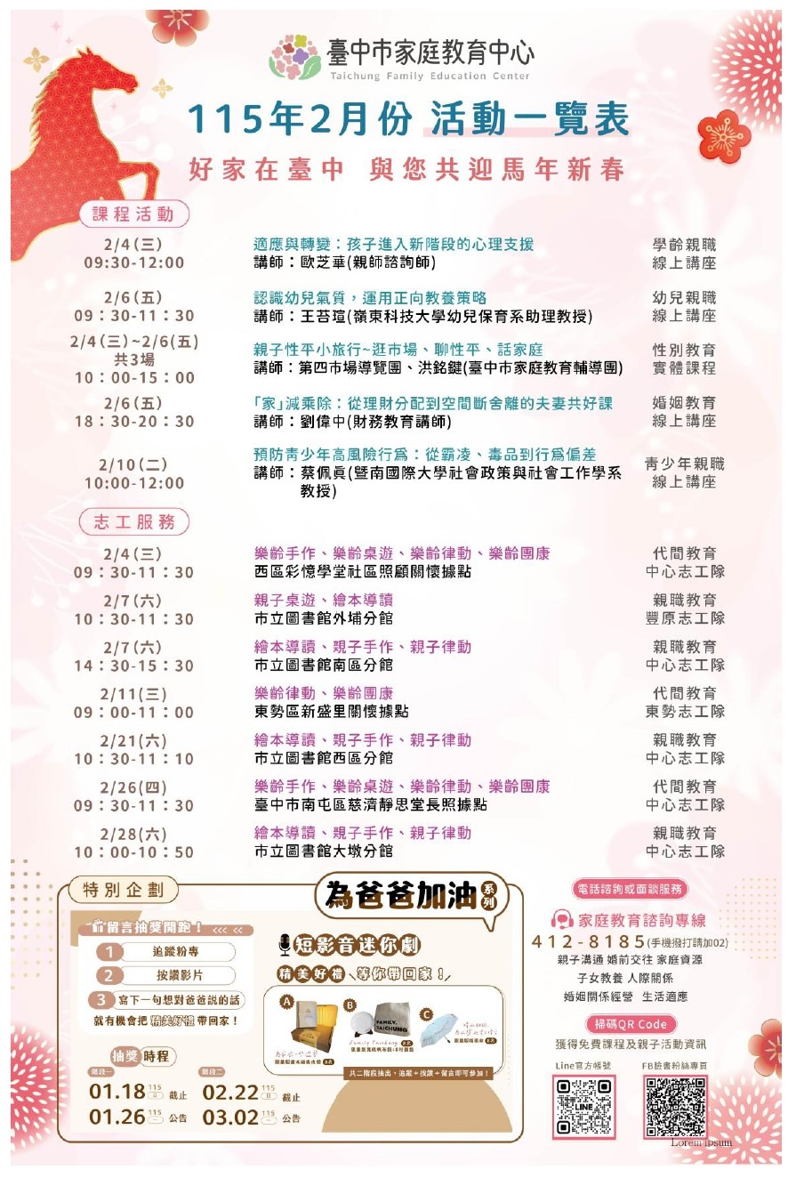 臺中市家庭教育中心 115年2月份活動一覽表。